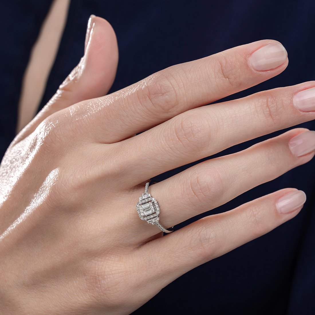 Blue Diamond dokunuşlarıyla tasarlanan 0.21 Karat Baget Pırlanta Yüzük, beyaz altının ışıltısıyla harmanlanmış durumdadır. Tasarımda yer alan baget ve yuvarlak kesimli pırlantalar özenle seçilmektedir. Modelin kendine özgü tasarım hatları son derece dikkat çekicidir. Taç kısmında bulunan minimal pırlantaların şık dokunuşu, modelin çok daha şık bir görünüm elde etmesini sağlar.